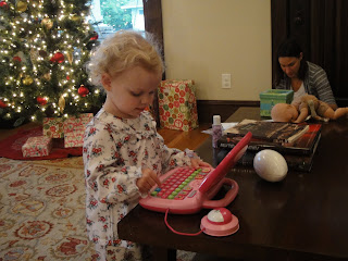 Daddy fried a turkey on Christmas afternoon. It was cold outside so everyone had a sip or two of a special distilled spirit that G brought over from Tennessee. It turned the dreary day into a "shiney" one. Along with the turkey we had baked ham, rice dressing, mac-n-cheese, corn macque chou, green beans, yams, cauliflower, deviled eggs and coconut cream pie for dessert. I took my afternoon nap while the adults ate. After dinner we went for a drive to see the Christmas lights in River Oaks. What a great holiday we had.